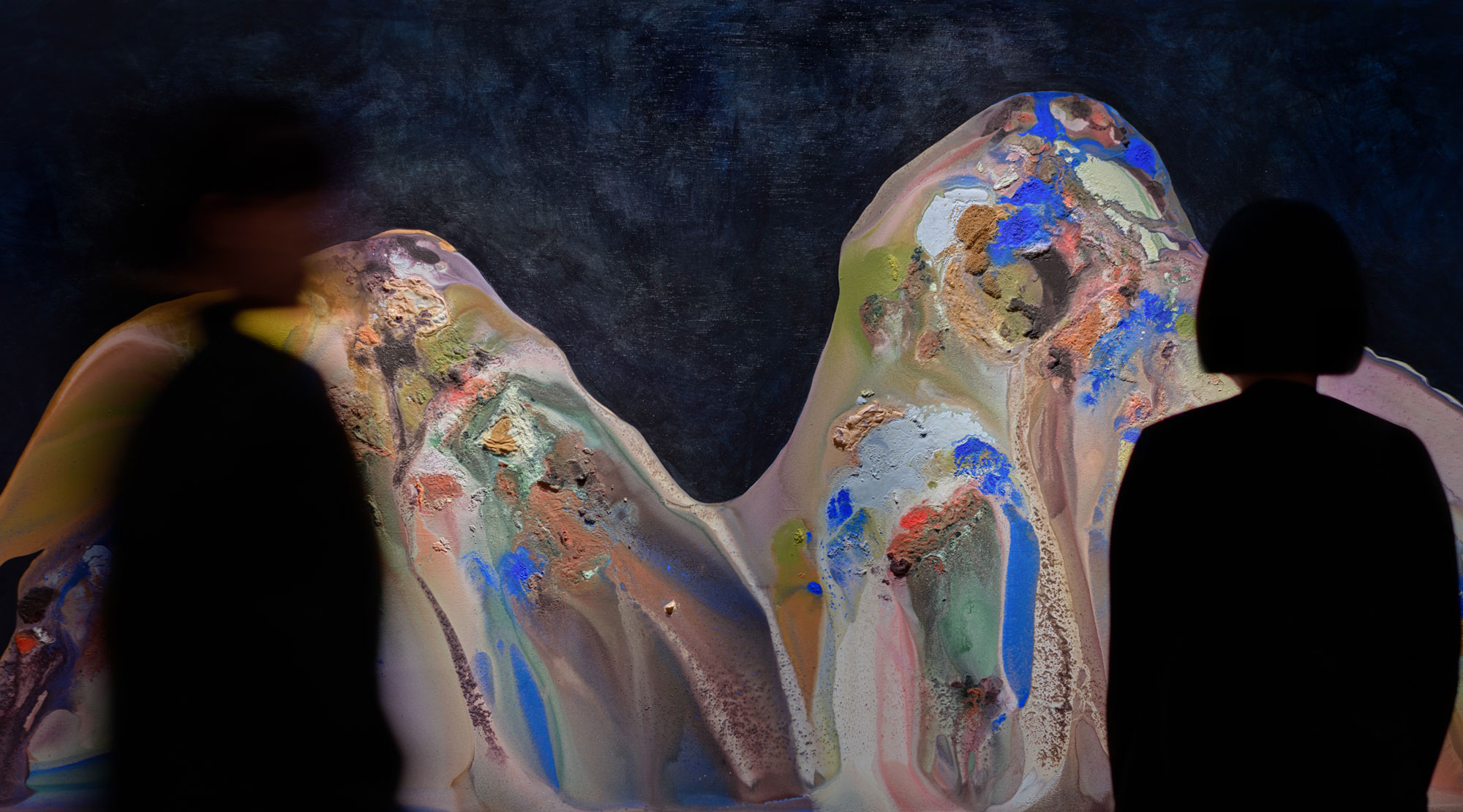 September, 2025 acrylic paint, dye, ink, sand on wood 123 x 243 x 5 cm. Photo by Jovian Lim.
